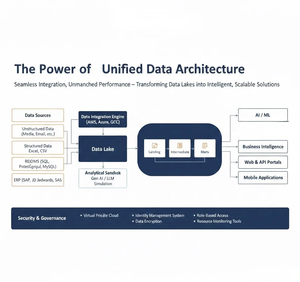 We engineer unified data lakes capable of storing structured and unstructured data at scale. This centralized repository serves as the foundation and deep historical analysis.